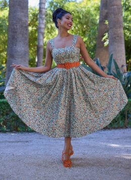 Beauty Louison Fire komt uit de ‘Legendary Liz’ collectie. Dit seizoen brengt het merk een sprankelende ode aan niemand minder dan stijlicoon Elizabeth Taylor, een tijdloze diva die generaties blijft betoveren. De swing jurk heeft verstelbare strikschouderbandjes, een bijpassende ceintuur die de taille accentueert en praktische zijzakken voor extra comfort. Uitgevoerd in luchtige, soepelvallende 100% katoen (zonder stretch) in saliegroen met een lieflijke bloemenprint. * Swing model * Verstelbare strikschouderbandjes * Blinde rits achterzijde * Afneembare riem, voor een extra ‘snatched’ taille * Voorzien van zakken! * Valt bij een lengte van 1,70 m over de knie