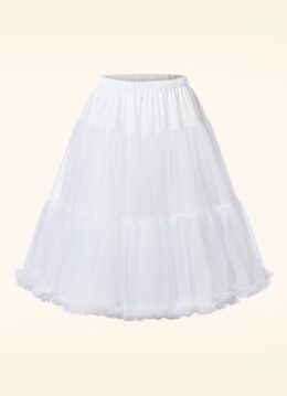 ”Behind every great twirl is a trusty petticoat!” De 2 lagen stof zorgen voor extra volume, bewegen gracieus met je mee en zijn afgezet met speelse ruches aan de onderzijde. De bovenkant is uitgevoerd in wit tule en de onderrok is gemaakt van een glanzende sateen. Afgewerkt met een elastieken band. Deze petticoat geeft iedere swing jurk net dat beetje extra! * Geschikt voor al onze swing dresses en rokken * Elastische tailleband * Onze gorgeous blondine Rachel is 1,72 m * De afgebeelde BH is niet verkrijgbaar in onze shop * Gorgeous influencer Miss Alba Banana is 1,75 m en droeg onze petticoat * Haar blouse en accessoires zijn haar eigen vintage treasures