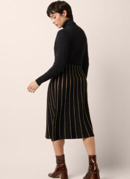 “Subtle shimmer, endless elegance!” Deze zwarte gebreide A-lijn rok ademt tijdloze klasse met een vleugje seventies glamour. Het streeppatroon met ingewerkte gouden glitterdraad laat haar subtiel schitteren bij elke stap. Gemaakt van een zachte, fijngebreide katoenmix met een vleugje kasjmier die luxueus aanvoelt op de huid en soepel met je meebeweegt. * A-lijn * Elastische tailleband * Geen rits of knopen; aantrekken en ‘ready to go’! * Valt bij een lengte van 1,70 m over de knie