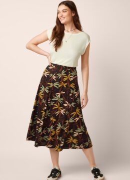 “Paradise found… in skirt form.” Deze zomerse midi rok is uitgevoerd in soepele en luchtige EcoVero viscose (stretcht niet!) in zwart, met een speelse palmbomenprint in oranje, mintgroen en mosterdgeel. Ze draagt heerlijk licht en zwiert prachtig met je mee. * Ritsluiting * Niet gevoerd * Valt bij een lengte van 1,70 m halverwege de kuit