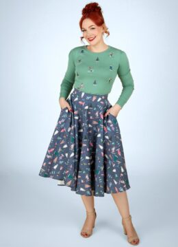 ‘Twirl into the jingle bell rockin spirit’ met deze prachtige swingrok! Ze is uitgevoerd in een stevige maar soepele, grijsblauwe katoenmix die prachtig met je mee beweegt. * Swing model: kan gecombineerd worden met een van onze petticoats * It has pockets! * Rits met haaksluiting achterzijde * Valt bij een lengte van 1,70 m over de knie