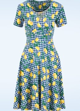 “When life gives you lemons, wear them beautifully.” Deze comfortabele jurk heeft een elegante V-halslijn met vaste overslag en flatterende plooitjes. De subtiele tailleband accentueert je figuur op natuurlijke wijze, terwijl de knielange, zwierige rok sierlijk met je meebeweegt. Gemaakt van een zachte, stretchy biologische katoenmix met een blauw-witte ginghamruit en speelse citroentjes. * Swing model * Vaste geplooide overslag * Geen rits of knopen; aantrekken en ready to go! * Valt net over de knie bij een lengte van 1,70 m