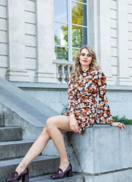 ”This dress brings back the good old days — in the best way!” Emmy is speels maar toch heel vrouwelijk door haar aansluitende top met V-halslijn en omslagkraag, flatterende 3/4 mouwen en reeks knoopjes. De taille wordt mooi geaccentueerd door het striklint vanwaar ze uitloopt in een flowy rok. Uitgevoerd in een heerlijk soepele en stretchy EcoVero viscosemix in zwart met een retro bloemetjesprint in verschillende herfstkleuren. * V-halslijn met omslagkraagje * 3/4 mouwen * Knopenrij * Afneembaar striklint voor een extra ‘snatched’ taille * Geen rits * Valt bij een lengte van 1,70 m boven de knie