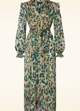 ”Wild thing… you make my heart sing!” Deze maxi beauty is uitgevoerd in een soepele, luchtige en geheel gevoerde zandkleurige stof (stretcht niet) voorzien van een luipaardprint in groen tinten en een ingewerkte glitterdraad. * Maxi jurk * Gevoerd voor extra comfort * Vaste overslag met drukknoop * Elastische tailleband  * Afneembare strikband voor een extra ‘snatched’ taille * Reikt bij een lengte van 1,70 m tot op de enkels