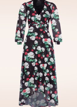 “She wore roses like a warning… soft, but never simple!” Deze betoverende maxi jurk is ontworpen door onze eigen in-house ontwerpers en is een ode aan tijdloze elegantie, geïnspireerd door de iconische stijl van Ava Gardner en haar ongedwongen charme in de film ‘Barefoot Contessa’ uit 1954. Ze heeft een elegante V-halslijn, lange doorschijnende mouwen en een geplooide tailleband vanwaar ze uitloopt in een flowy overslag maxi rok. Ze is uitgevoerd in een soepele en luchtige zwarte stof (stretcht niet!) voorzien van een bloemenprint in groen, crème en rood. * Maxi jurk * Gevoerde top met V-halslijn en plooitjes bij de buste * Bra strap holders zodat je bh bandjes niet gaan schuiven * Lange, licht doorschijnende mouwen met manchetten * Geplooide tailleband met vast riem detail * Gevoerde rok met overslag * Blinde rits in de zijnaad * Gorgeous Julia Fiore (Fiorevanil) is 1,70 m; haar accessoires zijn haar eigen vintage treasures * Let op; de kleur van het product op de video kan afwijken van de daadwerkelijke kleur van het product