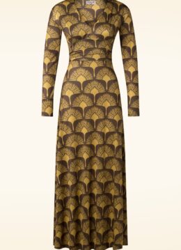 ”Me, myself and Mariana!” Mariana heeft een prachtige v-halslijn, een geplooide tailleband, lange mouwen en loopt uit in een chique lange maxi rok. Ze is uitgevoerd in een glad en licht glanzend, soepel en stretchy, slinky bruin stofje voorzien van een mosterdgele waaier print. * Maxi jurk * V-halslijn * Geplooide tailleband * Gevoerde top * Lange mouwen * Geen rits of knopen; aantrekken en ready to go! * Reikt tot op de enkel bij een lengte van 1,70 m