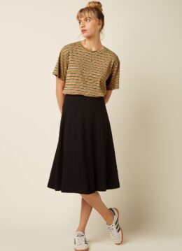 “Sustainable stripes with a retro twist!” De gestreepte print in warme herfstkleuren geeft haar die typische seventies flair, terwijl de flatterende midi-lengte en de elastische tailleband zorgen voor een comfortabele, vrouwelijke pasvorm. Uitgevoerd in een zachte, soepele EcoVero viscosemix die duurzaam geproduceerd is en heerlijk aanvoelt op de huid.   * A-lijn * Elastische tailleband * Geen rits of knopen; aantrekken en ‘ready to go’! * Valt bij een lengte van 1,70 m over de knie