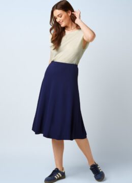 “Simply blue-tiful.” Deze midi rok is een echte allrounder die moeiteloos meegaat in elke look. Ze heeft een comfortabele elastische tailleband en zwiert soepel met je mee bij iedere stap. Ze is uitgevoerd in een soepele en luchtige EcoVero viscosemix en het effen beacon blauwe design maakt haar eindeloos combineerbaar! * A-lijn * Elastische tailleband * Geen rits of knopen; aantrekken en ‘ready to go’! * Valt bij een lengte van 1,70 m over de knie