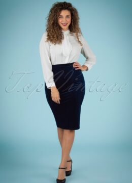 Met deze sexy en stijlvolle 50s Glendie Velvet Pencil Skirt in Navy ben je helemaal party-proof! Dit model sluit prachtig aan waardoor jouw rondingen perfect worden benadrukt. Uitgevoerd in een stretchy, navyblauwe fluwelen stof die je rondingen prachtig benadrukt zonder af te tekenen. Deze rok komt wel met een waarschuwing; ze is namelijk hot, hot hot! * Aansluitend taillemodel * Geen rits of knopen * Geen split * Exclusief bij Topvintage verkrijgbaar * Gorgeous brunette Yoëlle is 1,78 m