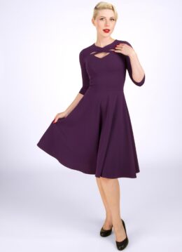 ”Purple is the colour of dreams, inspiring visions of grandeur!” Deze vintage geïnspireerde beauty heeft een opvallende semi sweetheart halslijn met een gekruist detail en is uitgevoerd in een stretchy auberginepaars crêpe achtig stofje dat heerlijk draagt. * Semi-swing model * Sweetheart halslijn met gekruist detail * 3/4 mouwen * Blinde rits achterzijde * Reikt bij een lengte van 1,70 m net over de knie * Exclusief bij Topvintage verkrijgbaar * Julia Fiore is 1,70 m
