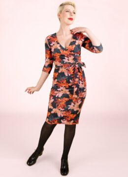 ”Fall is in the air!” Kamila heeft een overslag top, 3/4 mouwen en een prachtige print van gekleurde herfstbladeren. Ze is uitgevoerd in een stevige, maar soepele en stretchy, crêpe achtige zwarte stof, dat je rondingen perfect laat uitkomen zonder af te tekenen. * Aansluitend model * Gevoerde overslagtop * 3/4 mouwen * V-rug * Flatterende plooien * Afneembaar striklint, voor een extra ‘snatched’ taille * Blinde rits achterzijde * Julia Fiore is 1,70 m * Exclusief bij Topvintage verkrijgbaar * Reikt bij een lengte van 1,70 m tot net over de knie