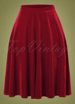 Feestdagen of gewoon een dagje full glamour? Deze 50s Sheila Swing Skirt in Claret Velvet is jouw sidekick! Deze beauty wordt hoog in de taille gedragen en waaiert prachtig uit waardoor je een super vrouwelijk zandloper figuur krijgt, oh la la. Uitgevoerd in een soepel vallende, stretchy, bordeauxrode fluwelen stof die mooi glanst zodra er licht op valt. Niets is zo charmant als een vrouw in glanzend fluweel! * Swing model * Zijwaartse steekzakken * Geen rits of knopen * Elastische taille * Valt net over de knie bij een lengte van 1,70 m * Exclusief bij Topvintage verkrijgbaar