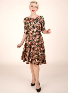 Zet de bloemetjes buiten in deze fleurige, zwierige beauty! Uitgevoerd in een soepele en stretchy donkergroene stof met een herfstachtige bloemenprint in oranje- en bruintinten. L-O-V-E! * Swing stijl * Gevoerde top voor extra comfort * V-rug * 3/4 mouwen * Blinde rits achterzijde * Valt over de knie bij een lengte van 1,70 m * Exclusief bij Topvintage verkrijgbaar