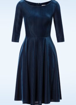 ”Oh la la… who’s that lady in velvet?!” Jij natuurlijk! Uitgevoerd in een prachtig zacht, stretchy, navyblauw stofje met de luxe look and feel van fluweel dat heerlijk draagt. * Swing model * Boothals * Gevoerde top * 3/4 mouwen * Geplooide rok * Blinde rits achterzijde * Valt bij een lengte van 1,70 m op de knie * Exclusief bij Topvintage verkrijgbaar