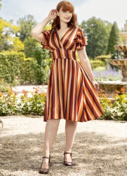 Een echte vintage beauty en perfect voor elke gelegenheid! Sadie heeft een vaste overslag, korte vlindermouwtjes en loopt vanaf de taille uit in een flowy semi-swing rok. Ze is uitgevoerd in een glad en soepel, stretchy en slinky stofje met een print van strepen in verschillende donkere herfsttinten, dat heerlijk draagt en niet kreukt. Geniet van de complimentjes die je krijgt, zodra je Sadie draagt! * Semi-swing stijl * Gevoerde top * Vaste overslag * Korte vlindermouwen * Geplooide tailleband * Geen rits of knopen; aantrekken en ready to go! * Exclusief bij Topvintage verkrijgbaar * Valt bij een lengte van 1,70 m over de knie