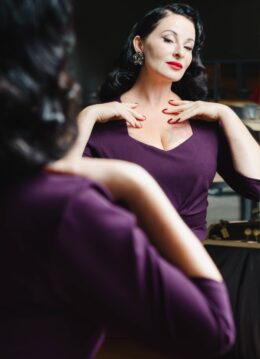 “Slinky, swingy and soaked in purple charm.” Romy is uitgevoerd in een glad en soepel, stretchy, pruimpaars slinky stofje dat heerlijk draagt en niet kreukt. Geniet van de complimentjes die je krijgt, zodra je Romy draagt! * Semi-swing stijl * V-hals met overslag * Geheel gevoerd (m.u.v. de mouwen) * Lange pofmouwen met manchetten * Afneembaar striklint in de taille * Geen rits of knopen; aantrekken en ready to go! * Exclusief bij Topvintage verkrijgbaar * Valt bij een lengte van 1,70 m over de knie
