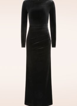 “She was mystery wrapped in black velvet.” Deze beauty heeft een elegante boothals, lange mouwen, plooien in de taille die super flatterend werken en een prachtige uitlopende maxi rok. Uitgevoerd in een soepele en stretchy, zwarte stof met de look and feel van luxe fluweel. * Maxi jurk * Boothals * Gevoerde top * Lange mouwen * Flatterende plooien in de taille * Blinde rits achterzijde * Uitlopende maxi rok * Exclusief bij Topvintage verkrijgbaar * Reikt bij een lengte van 1,70 m tot aan de enkel