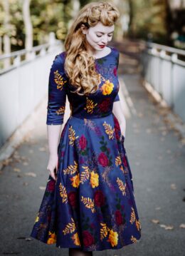 “Wearing this floral dress is like being hugged by a garden, minus the thorns!” 😉 Uitgevoerd in een stevige maar toch soepele zwarte katoenmix met een fijne stretch voorzien van een prachtige bloemenprint die heerlijk draagt.   * Vierkante halslijn * 3/4 mouwen * It has pockets! * Blinde ritssluiting achterzijde * Te combineren met een petticoat voor een extra feestelijk effect * Valt bij een lengte van 1,70 m over de knie