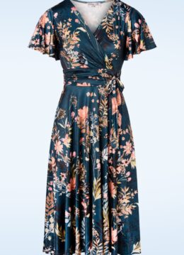 Irene overslag swing jurk met bloemenprint in petrol blauw