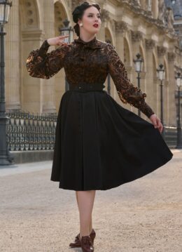 “Elegance with a romantic twist.” Janalie Lou is afkomstig uit de nieuwe collectie en geïnspireerd op de extraordinaire Marie-Louise Carven, een baanbrekende Franse couturière uit de jaren ’40 en ’50. Deze luxueuze, vrouwelijke jurk heeft een prachtig lijfje van een licht doorschijnende goudbruine stof, rijkelijk versierd met verfijnde bloemdetails van zwart kant en speelse pofmouwen. De subtiele strikbanden in de hals en de functionele knoopjes aan de voorzijde geven haar een charmante, romantische touch. * Swing model * Opstaande kraag met vaste strikbanden * Geplooid bij de buste * Gevoerd lijfje * Lange pofmouwen (niet gevoerd) * Knopenreeks voorzijde * Afneembare riem voor een extra ‘snatched’ taille * It has pockets! * Valt bij een lengte van 1,70 m over de knie