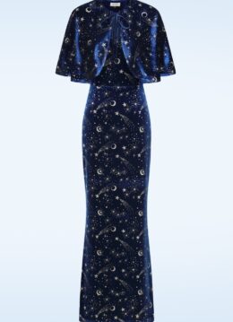 “Enchanted celestial elegance, from head to hem.” Deze opvallende maxi jurk heeft een afneembare cape die je schouders bedekt en is perfect voor het feestelijke seizoen! Ze heeft verstelbare spaghetti bandjes en loopt vanaf de taille over in een aansluitende maxi jurk. Uitgevoerd in een middernachtblauwe, glanzende en stretchy stof met de luxe look and feel van fluweel, voorzien van goudkleurige glitter sterren en maantjes. * Maxi jurk * Afneembare cape * V-hals * Gevoerde top * Verstelbare spaghettibandjes * Rits- en haaksluiting achterzijde * Reikt bij een lengte van 1,70 m tot aan de enkel
