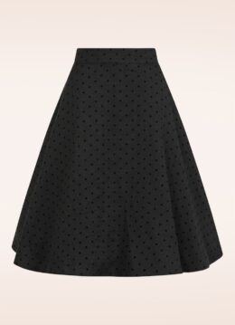“Monochrome magic, dotted in velvet.” Deze swing beauty is voorzien van zwarte, fluwelen polkadotjes en is uitgevoerd in een stevige maar soepele, geweven structuur stof in zwart. * Swing rok * It has pockets! * Rits met haaksluiting achterzijde * Valt bij een lengte van 1,70 m over de knie
