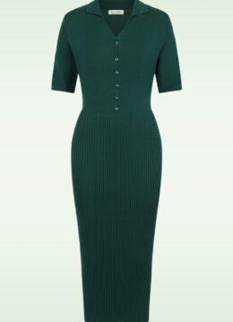 “Knitted comfort, collared in style.” Deze A-lijn jurk heeft een sierknopen reeks, een puntig kraagje, 1/2 mouwtjes en is uitgevoerd in een iets dikkere, fijn gebreide, stretchy viscosemix in donkergroen. * A-lijn model * Kraagje * Sierknopen * 1/2 mouwtjes * Geen rits of knopen; aantrekken en ready to go! * Valt bij een lengte van 1,70 m ruim over de knie