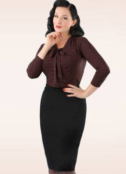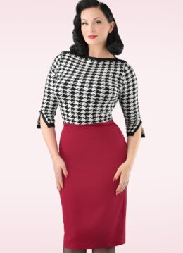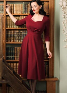 Vrouwelijk en flirty deze 50s Ruby Swing Dress! Wow, wat een schoonheid! Deze vintage geïnspireerde beauty heeft een elegante diamantvormige halslijn, een brede tailleband en flatterende plooitjes die sierlijk doorlopen naar de buste. De semi-swing rok in combinatie met de aansluitende top geeft jou een super vrouwelijk fifties silhouet. Uitgevoerd in een stretchy bordeauxrood stofje dat heerlijk draagt. Dit jurkje zal je hart veroveren, en niet alleen die van jou… 😉 * Semi-swing model * Diamantvormige halslijn * 3/4 mouwen * Blinde rits achterzijde * Onze black beauty Ava is 1,69 m * De afgebeelde oorbellen zijn niet meer verkrijgbaar in onze shop