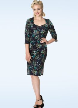”Evening blue like a twilight wish!” De inspiratie van onze in-house designers dit seizoen was ”Bright Dreams in Neon Lights”. Maar het blijft niet bij dromen want deze collectie is als een droom die ook daadwerkelijk uitkomt! Deze classy swing beauty beweegt gracieus met je mee als je de sterren van de hemel danst. Ze is voorzien van corrigerende bengaline shapewear en is uitgevoerd in een zware, iets dikkere, stretchy glitterstof in avondblauw voor een spotlight waardige fit. ”Pure starlight in motion!” * Swing model * V-hals met knoopdetail * 1/2 mouwen die ietwat off-shoulder vallen * Afneembare riem, voor een extra ‘snatched’ taille * Volledig gevoerd (corrigerende bengaline shapewear) * Blinde rits in de zijnaad * Gorgeous model en Pin Up Doll next door Greta Gardner is 1,72: haar pumps en accessoires zijn haar eigen treasures