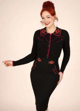 ”Roses are red, violets are blue, you are nice and this skirt is too!” Dit aansluitende prachtexemplaar met fantastische geborduurde rozen en zijwaartse steekzakjes met rode details mag niet ontbreken in jouw collectie. Uitgevoerd in een stevige maar soepele bengaline zwarte stof, voor een perfecte aansluitende maar toch comfy fit. * Aansluitend model * Zijwaartse steekzakjes * Blinde rits achterzijde * Splitje aan de achterzijde * Valt bij een lengte van 1,70 m net over de knie * Maak je look compleet en combineer haar met de bijpassende Rose embroidery collar cardigan in zwart