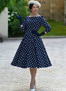 “Classic charm with a playful twist!“ Deze marineblauwe swing jurk heeft een elegante boothals, 3/4 pofmouwen en handige zakken, perfect voor een speels en vrouwelijk detail. Uitgevoerd in een stevige, maar soepele katoenmix en versierd met tijdloze witte polkadots, brengt ze instant retro flair in je look. * Swing jurk * Boothals * 3/4 pofmouwen * Voorzien van zakken! * Blinde ritssluiting aan de achterzijde * Te combineren met een petticoat voor een extra feestelijk effect * Valt bij een lengte van 1,70 m over de knie