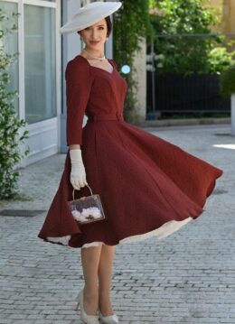 “Timeless romance, effortless style!” Breng een vleugje elegantie in je garderobe met deze bordeauxrode swing jurk en bijpassende bolero. De subtiele sweetheart halslijn en het reliëfbloemenpatroon zorgen voor een vrouwelijke, charmante uitstraling, terwijl de zachte, licht stretchende stofmix zorgt voor optimaal comfort. Ideaal voor een feestje, diner of een verfijnde daglook – compleet met de bolero voor een stijlvolle finishing touch. * Swing jurk met bijpassende bolero * Subtiele sweetheart halslijn * Mouwloos * Voorzien van zakken! * Blinde ritssluiting aan de achterzijde * Te combineren met een petticoat voor een extra feestelijk effect * Valt bij een lengte van 1,70 m over de knie