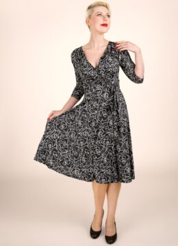 ”Darling, shine. That’s all!” Aria heeft een prachtige grafische bloemenprint en is uitgevoerd in een soepele en stretchy, slinky zwarte stof met een lichte glans die licht van gewicht is en niet kreukt. * Semi-swing model * V-halslijn * Vaste overslag * 3/4 mouwen * Geplooide tailleband met vaste strik * Geen rits of knopen; aantrekken en ready to go! * Valt over de knie bij een lengte van 1,70 m * Exclusief bij Topvintage verkrijgbaar