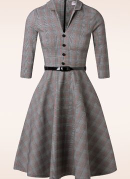 ”Pied de poule reinvented in swing perfection.” Deze classy semi swing beauty is uitgevoerd in een stevige maar stretchy stof met een zwart/wit pied de poule motief die heerlijk draagt. * Swing model * Puntig kraagje * Sierknopen * 3/4 mouwen * Afneembaar lakriempje, voor een extra ‘snatched’ taille * Met zakken! * Blinde rits achterzijde * Valt bij een lengte van 1,70 m net over de knie * Exclusief bij Topvintage verkrijgbaar