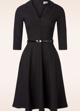 ”Effortlessly chic, effortlessly me!” Deze classy semi swing beauty heeft een elegante v-halslijn met revers kraag, decoratieve knoopjes aan de voorzijde en is voorzien van handige steekzakken. Ze is uitgevoerd in een stevige maar stretchy bengaline achtige zwarte stof voorzien van een witte krijtstreep, die heerlijk comfortabel draagt. * Swing model * V-halslijn met revers kraagje * Sierknopen aan de voorzijde * 3/4 mouwen * Afneembaar lakriempje, voor een extra ‘snatched’ taille * Voorzien van zakken! * Blinde rits achterzijde * Valt bij een lengte van 1,70 m net over de knie * Exclusief bij Topvintage verkrijgbaar