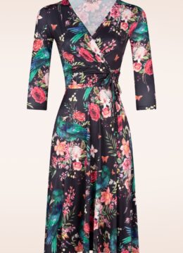 “Swinging through the day with birds and blooms!” Deze beauty heeft een elegante overslag top met V-halslijn, 3/4 mouwen en loopt vanaf de flatterende, geplooide tailleband uit in een semi-swing rok, die zwierig met je mee beweegt bij elke stap! Uitgevoerd in een soepele en stretchy, licht glanzende, slinky stof in marineblauw, voorzien van een prachtige print van bloemen en vogels. Tevens is ze licht van gewicht en kreukt ze niet. * Semi-swing model * V-halslijn * Vaste gevoerde overslag * 3/4 mouwen * Geplooide tailleband met vaste strik * Geen rits of knopen; aantrekken en ready to go! * Valt over de knie bij een lengte van 1,70 m * Exclusief bij Topvintage verkrijgbaar