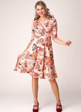 ”Blooming beauty in every petal!” Aria is uitgevoerd in een soepele en stretchy, slinky stof met een lichte glans die licht van gewicht is en niet kreukt. * Semi-swing model * V-halslijn * Vaste overslag * 3/4 mouwen * Geplooide tailleband met vaste strik * Geen rits of knopen; aantrekken en ready to go! * Valt over de knie bij een lengte van 1,70 m * Exclusief bij Topvintage verkrijgbaar