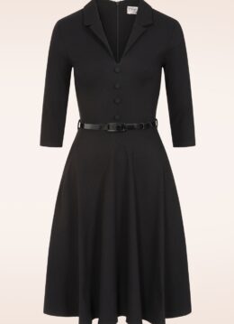 “Flirty swing, rich texture… black has never felt so alive.” Deze classy semi swing beauty is uitgevoerd in een stevige maar stretchy begaline achtige textuurstof die heerlijk draagt. * Swing model * Puntig kraagje * Sierknopen * 3/4 mouwen * Afneembaar lakriempje, voor een extra ‘snatched’ taille * Met zakken! * Blinde rits achterzijde * Valt bij een lengte van 1,70 m net over de knie * Exclusief bij Topvintage verkrijgbaar