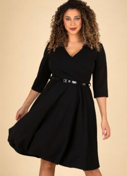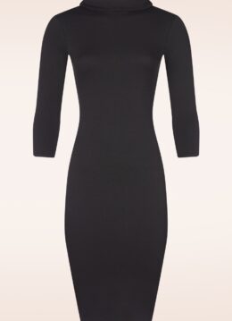 “Black beauty, bold moves!” De prachtige Eden heeft een sexy aansluitende fit met 3/4 mouwen en een speels keyhole detail. Ze is uitgevoerd in een soepele en stretchy, crêpe-achtige zwarte stof die heerlijk comfortabel draagt. * Aansluitend model * Hoge halslijn met keyhole detail * 3/4 mouwen * Blinde rits achterzijde * Valt bij een lengte van 1,70 m over de knie * Exclusief bij Topvintage verkrijgbaar