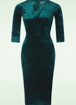”Feeling grand in green!” Curve hugging Emerald is uitgevoerd in een soepele en stretchy, groene stof met de luxe look and feel van fluweel. “Stop dreaming and start ordering!” * Pencil model * Hoge, ronde halslijn * 3/4 mouwen * Blinde rits achterzijde * Valt bij een lengte van 1,70 m over de knie * Exclusief bij Topvintage verkrijgbaar