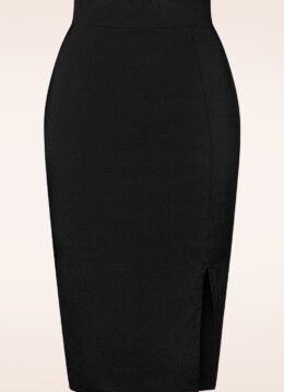 De 50s Eleonora Pencil Skirt in Black is een klassieke veelzijdige rok! Deze rok wordt hoog in de taille gedragen en is uitgevoerd in een stretchy, zwarte bengaline stof die je rondingen perfect benadrukt. Eindeloos combineren verzekerd met deze tijdloze topper! * Aansluitend hoog taille model * Split zijkant * Blinde rits achterzijde * Exclusief bij Topvintage verkrijgbaar * Valt bij een lengte van 1,70 m over de knie