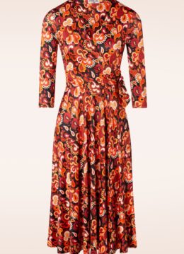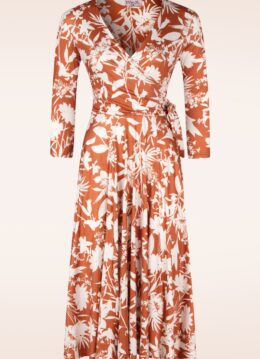 Voel je op en top vrouw in deze Colette flower swing jurk! Ze heeft een prachtige geplooide overslagtop met een sexy V-halslijn en een sierlijk strikdetail in de taille. De flatterende swing rok en 3/4 mouwen zorgen voor een flinke portie elegantie, wow! Ze is uitgevoerd in een glad en soepel, licht glanzend, stretchy, roestbruin stofje voorzien van een crème kleurige print van bloemen en bladeren, dat garant staat voor veel kreukvrij draagplezier. Geniet van de complimentjes die je krijgt, zodra je Colette draagt! * Swing stijl * Vaste gevoerde overslag * 3/4 mouwen * Vaste strikbandjes * Geen rits of knopen; aantrekken en ready to go! * Exclusief bij Topvintage verkrijgbaar * Valt bij een lengte van 1,70 m over de knie
