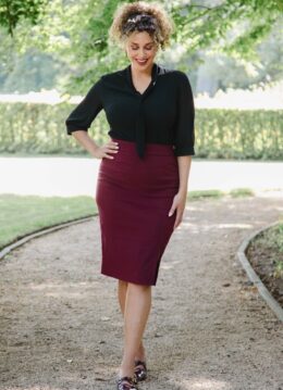 “Business? Maybe. Bombshell? Definitely!” Beauty Evangeline heeft een hoge halslijn, 3/4 mouwen, een flatterende geplooide tailleband en loopt vanaf daar over in een aansluitende rok, die je rondingen perfect omarmt, zonder af te tekenen. Ze is uitgevoerd in een iets dikkere, stretchy, crêpe achtige structuurstof in een prachtige wijnrode kleur. * Aansluitend model * 3/4 mouwen * Geplooide tailleband * Blinde rits achterzijde * Exclusief bij Topvintage verkrijgbaar * Valt bij een lengte van 1,70 m net over de knie