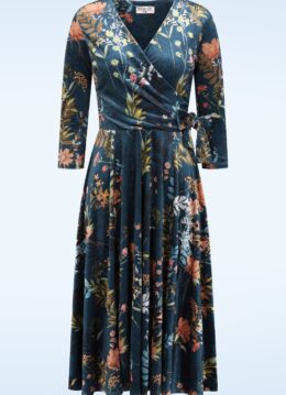 Voel je op en top vrouw in Colette! Ze heeft een prachtige geplooide overslagtop met een sexy V-halslijn en een sierlijk strikdetail in de taille. De flatterende swingrok en 3/4-mouwen zorgen voor een flinke portie elegantie — wow! Ze is uitgevoerd in een zacht, soepel en stretchy stofje met de look & feel van fluweel, bezaaid met bloemen. Dat staat garant voor kreukvrij draagplezier en een luxueuze uitstraling. Geniet van de complimentjes zodra je Colette draagt! * Swing stijl * Gevoerde top * Vaste overslag * 3/4 mouwen * Vaste strikbandjes * Geen rits of knopen; aantrekken en ready to go! * Exclusief bij Topvintage verkrijgbaar * Valt bij een lengte van 1,70 m over de knie