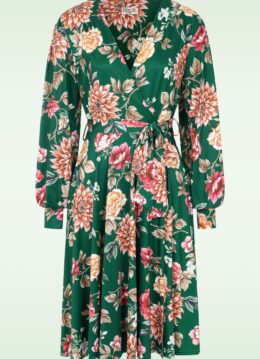 Voel je op en top vrouw in deze Colette Floral swing jurk! Ze heeft een prachtige geplooide overslagtop met een sexy V-halslijn en een sierlijk strikdetail in de taille. De flatterende swing rok en 3/4 mouwen zorgen voor een flinke portie elegantie, wow! Ze is uitgevoerd in een glad en soepel, licht glanzend, stretchy, kaki stofje voorzien van een kleurrijke bloemenprint en dat garant staat voor veel kreukvrij draagplezier. Geniet van de complimentjes die je krijgt, zodra je Colette draagt! * Swing stijl * Vaste gevoerde overslag * 3/4 mouwen * Vaste strikbandjes * Geen rits of knopen; aantrekken en ready to go! * Exclusief bij Topvintage verkrijgbaar * Valt bij een lengte van 1,70 m over de knie