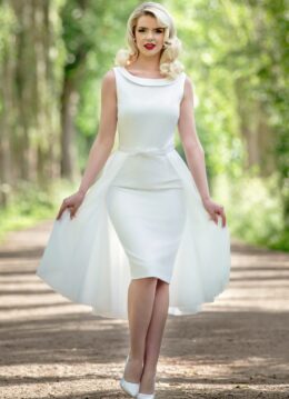 ‘’Traveling from Miss to Mrs!” Dit seizoen hebben onze eigen in-house ontwerpers zich laten inspireren door de wereldse vrouw die straalt, waar ze ook gaat of staat. The Arabella Bridal pencil jurk is perfect voor DE grote dag. Ze heeft een aansluitende top met elegante hoge ronde halslijn, scoop rug en een prachtige afneembare tule rok. Je ziet er niet alleen uit als een mooi verpakt cadeau, maar zult je ook zo voelen want je rondingen zullen prachtig tot hun recht komen. Uitgevoerd in een high quality witte stof met een lichte stretch voor een ‘Divalicious’ fit die nauw aansluit zonder daarbij af te tekenen. ”Happily ever after begins!” * Aansluitend model * Hoge ronde halslijn * Scoop rug * Bra strap holders zodat je bh bandjes niet gaan schuiven * Volledig gevoerd * Afneembare overskirt van tule (voorzien van strikdetail en drukknoopjes) * Split achterzijde * Blinde rits achterzijde * Gorgeous Rachel is 1,72 m: haar pumps en accessoires zijn haar eigen vintage treasures