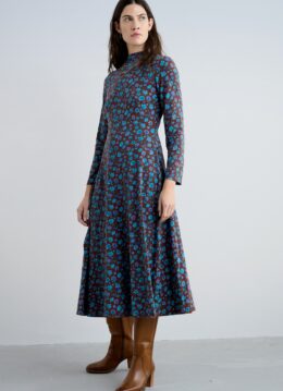 “Effortless en easy.” Deze beauty beweegt mee met elke stap en is gemaakt van een zachte en stretchy bruine organische katoenmix met een bloemenprint in verschillende blauwtinten. Het aangesloten bovenlijfje en de iets uitlopende rok creëren een subtiel flared silhouet, compleet met lange, aansluitende mouwen en een comfortabele col. * Midaxi jurk * Col kraagje * Lange mouwen * Geen rits of knopen; aantrekken en ready to go! * Uitlopende rok * Valt bij een lengte van 1,70 m over de kuit