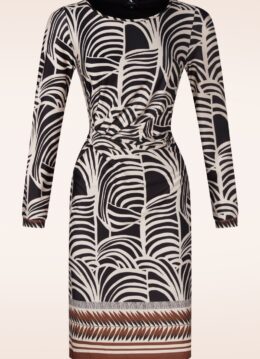 ”She’s a top knot!” Deze Veronique jurk heeft een subtiele A-lijn en is uitgevoerd in een soepele en stretchy, gladde slinky stof met een StayFresh coating en een zwart/witte print met bruine details aan de onderzijde. * Subtiele A-lijn * Lange mouwen * Gevoerd * Geen rits of knopen; aantrekken en ready to go! * Valt bij een lengte van 1,70 m tot net boven de knie