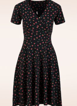 “Cute, comfy & blooming pretty.” Deze comfortabele jurk heeft een elegante V-halslijn met vaste overslag en flatterende plooitjes. De subtiele tailleband accentueert je figuur op natuurlijke wijze, terwijl de knielange, zwierige rok sierlijk met je meebeweegt. Gemaakt van een zachte, stretchy biologische katoenmix in zwart, met een romantische, retro-geïnspireerde print van lieflijke bloemetjes. * Swing model * Vaste geplooide overslag * Geen rits of knopen; aantrekken en ready to go! * Valt net over de knie bij een lengte van 1,70 m