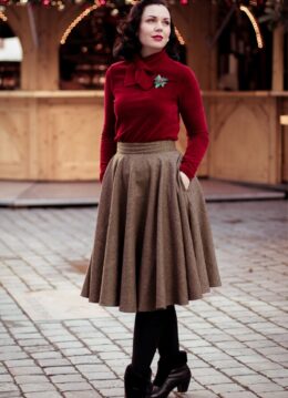 Swing your way into winter met deze Sophie rok! Dit fourties pareltje draag je hoog in de taille, vanwaar zij uitloopt in een klassieke, elegante swing rok. Uitgevoerd in een geweven, dikkere maar soepel vallende wolmix (stretcht niet!) met een klein classy ruitje in bruin en volledig gevoerd waardoor zij heerlijk draagt. De winterperiode kan zo mooi zijn, zeker met een rok als Sophie in je kast 😉 * Swing rok * Zijwaartse steekzakken * Rits- en knoopsluiting achterzijde * Volledig gevoerd * Valt over de knie bij een lengte van 1,70 m * Gedragen door gorgeous Madame Rhos